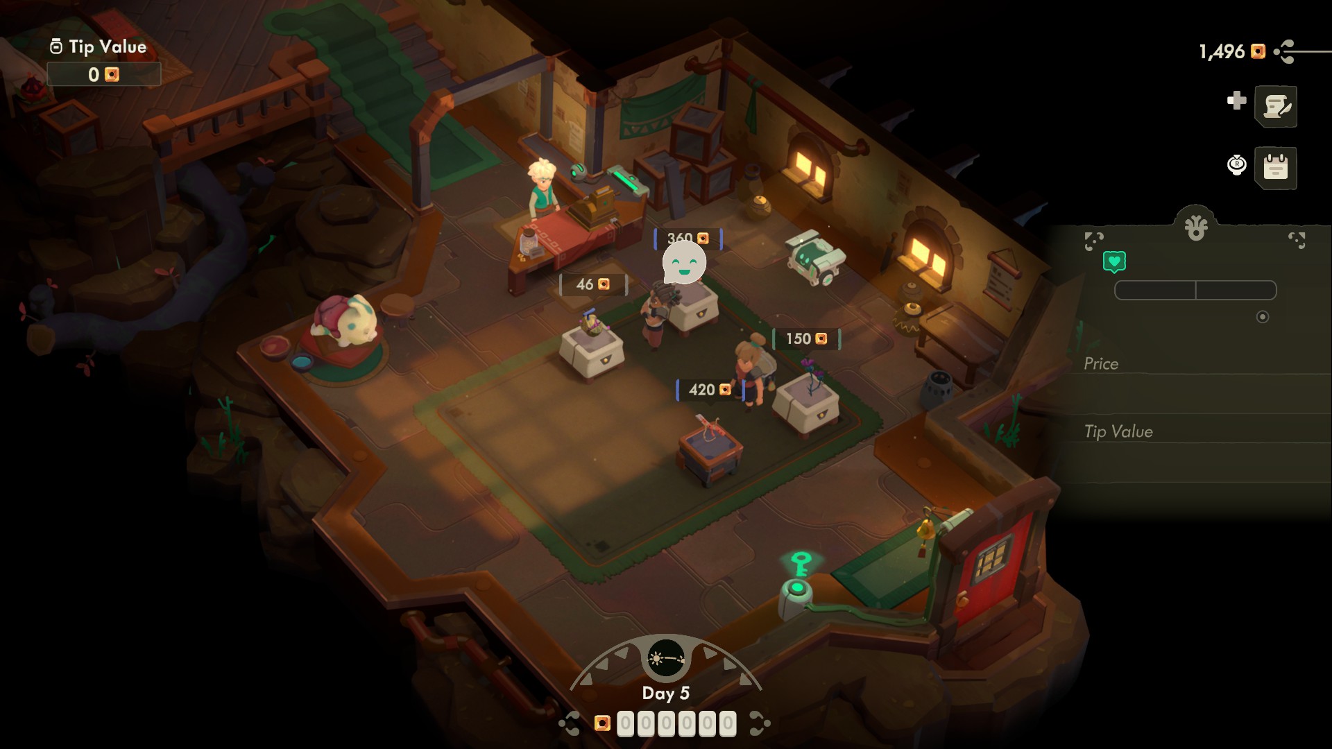 If anything, it’s even better. There are games within games in Moonlighter 2; the backpack item management that burns items or increases their value, or crystallises them, or turns them into dolls; the back and forth with customers trying to find that sweet spot price where they aren’t discouraged, but instead go away both happy and poor; the constant choices to be made about increasing your loadout, item spaces, potion number, or weapons, or instead to spend it all on upgrades to the shop, so that you can rake in more cash next time.