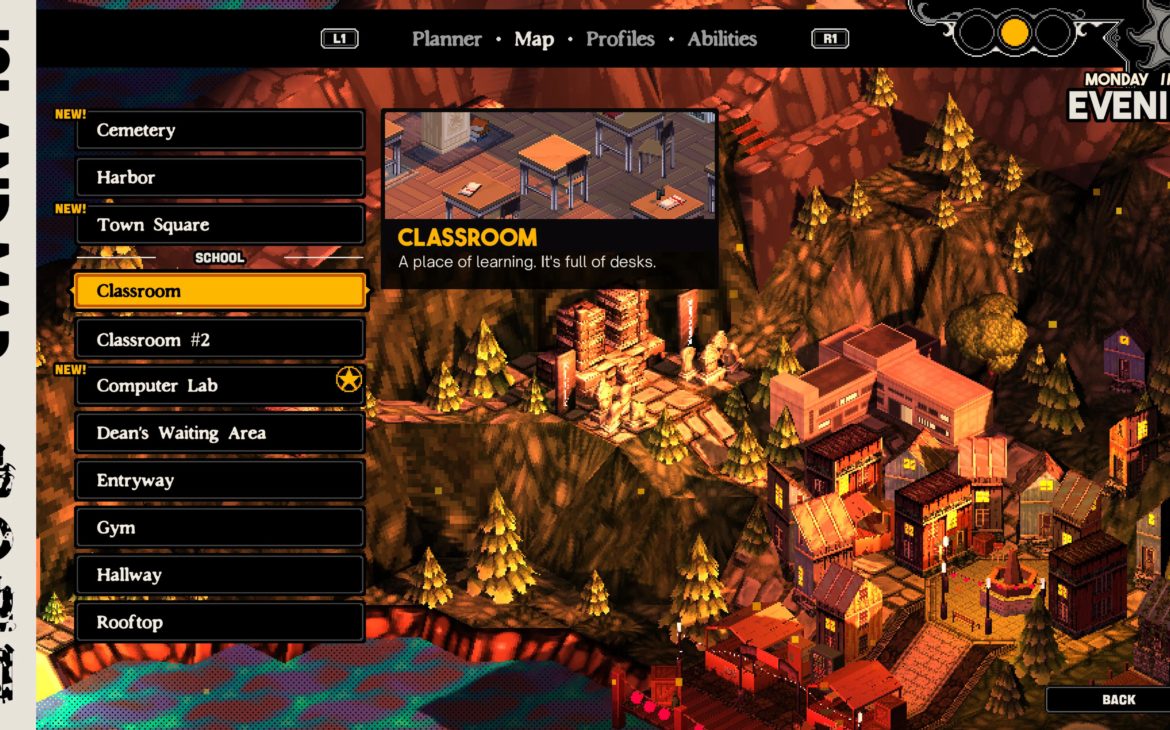 The location menu tells you where the next story-progressing scene is going to happen so that you can keep things moving. There’s only very little reward for exploring any other locales, especially near the beginning, because you have no money and there’s nothing to do. This does open up later and you will find scenes where you can increase relationship points with your party for examples, and eventually afford some moves. There are also multiple other screens that for many hours are not adequately explained. For example, one covered in squares, which turned out to be abilities you can research and learn, but I’m not sure I ever found a tutorial for it, even when it is finally opened up and useable.