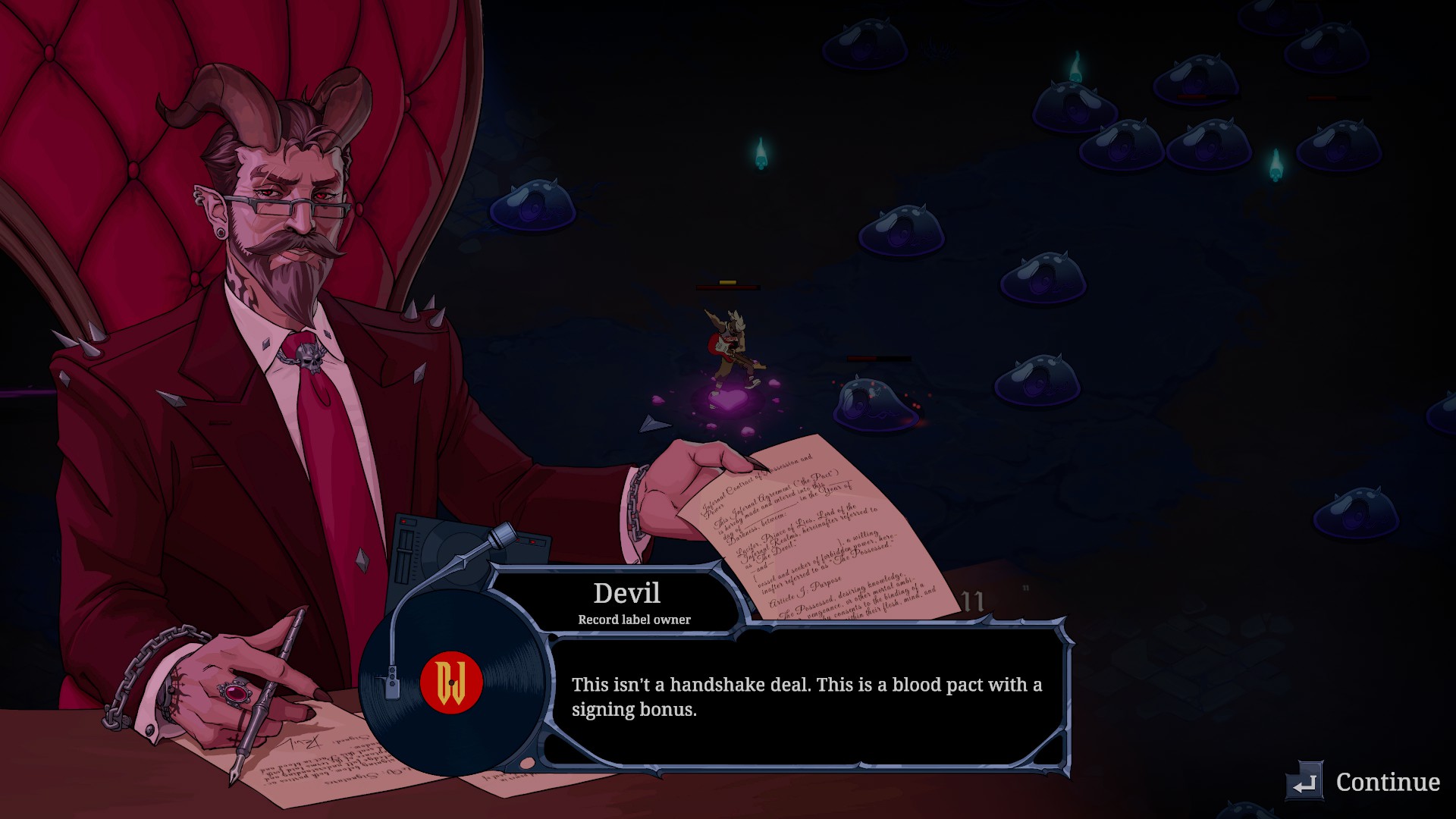 Unlike other boons, ol’ Hipster McGoatbeard will offer a tainted one. One that, unfortunately, cannot be passed on. Literally, you can’t just ignore him and carry on throwing the horns and fireballs at demons.
