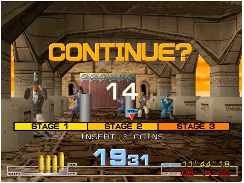 If you haven’t played Time Crisis before, the core gameplay is pretty straightforward. One points the gun at the screen, pulls the trigger at anyone pointing a gun at you, and shoots them first. What Time Crisis made popular was a cover system. Unlike House of the Dead’s “shoot off screen to reload” mechanic, this one was tactical as well as necessary.
