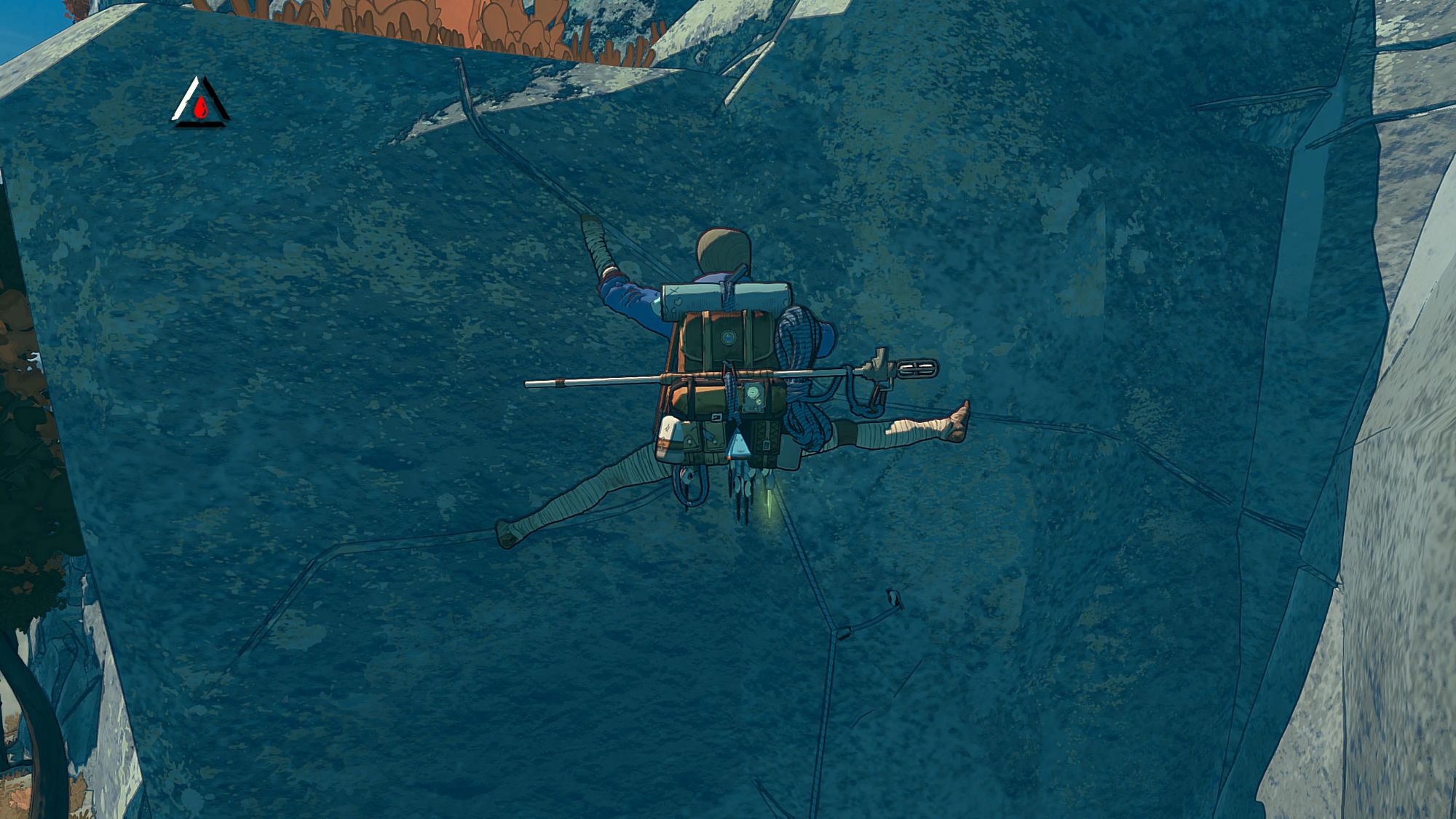 As well as working out an optimal climbing route, players must keep an eye on Aava’s well-being too. Besides an overall life/health bar, players must also keep an eye on hydration, hunger and temperature of our determined mountaineer. We’ll look at that aspect of maintenance in a bit, but in terms of climbing it’s a crucial part.