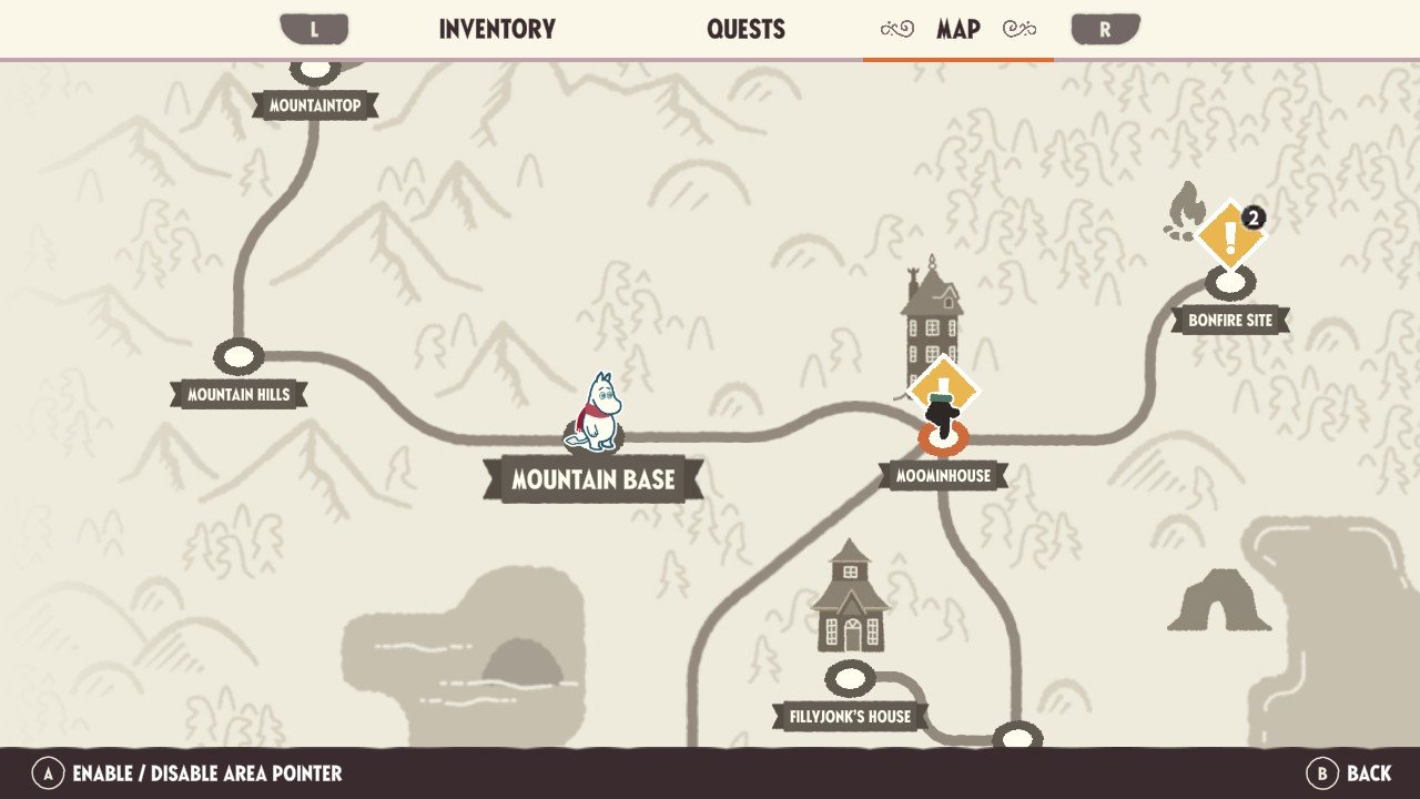 Moomintroll Winter’s Warmth is a much more linear story than its predecessor; where Snufkin’s adventure gave you mostly free rein to visit all of Moominvalley in a sort of open-world, Winter’s Warmth moves you from event to event, following the events of the novel in gamified ways. The map isn’t an open world, but instead a series of contained locations. While it looses a little something in not being a fully explorable valley, it gains a sense of scale, where Snufkin’s game made Moominvalley feel very small.