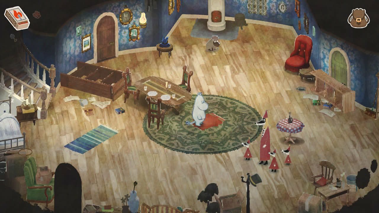 After lighting his house, investigating strange noises, and finding his way out into the snow for the very first time, Moomin is confronted with an adventure of discovery; the winter world and its denizens are entirely alien to him, and as he can’t get back to sleep, he may as well learn and make himself useful. Over the course of the game, Moomin meets Too-Ticky, a knowledgeable lady who lives in the Moomins ‘ bathhouse during winter, discovers the Lady of the Cold, encounters the winter beings, has snowball fights with Little My, and slowly guides everyone he meets either back to Moominhouse for shelter, or towards a great winter bonfire to welcome back the Spring.