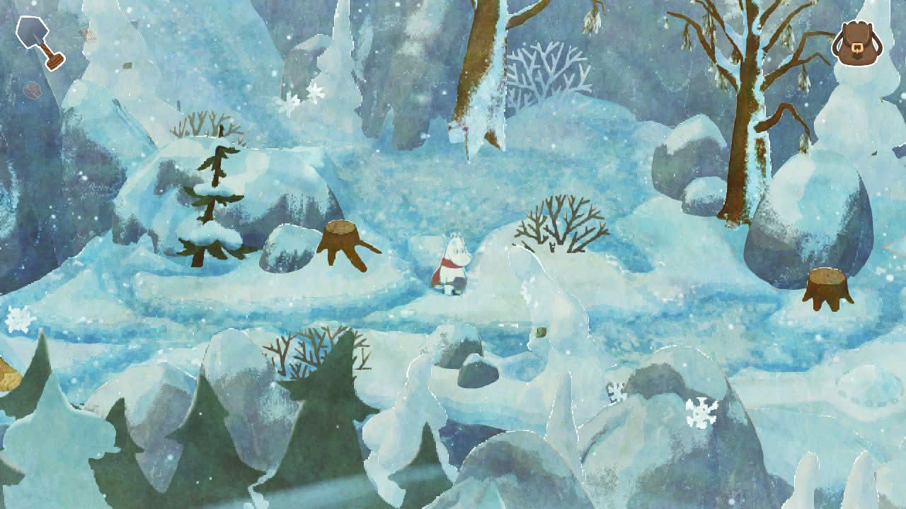 The gameplay of Winter’s Warmth also deviates somewhat from that of Snufkin’s adventure. Instead of instruments and melody-based puzzles, a little stealth and rebellion, and a little light puzzle platforming, Moomintroll has matches for fire, some mittens so that he can roll snowballs to throw, a spade for digging and an axe for chopping…and a little light puzzle platforming. So not far off, just changes that are in keeping with Moomin as a character – ie he’s not a harmonica-playing wanderer, who needs an open world game about melodies. He’s a Moomin, lost in a vast and transformed snowy wilderness he thought he knew well, and he needs to be able to get around.